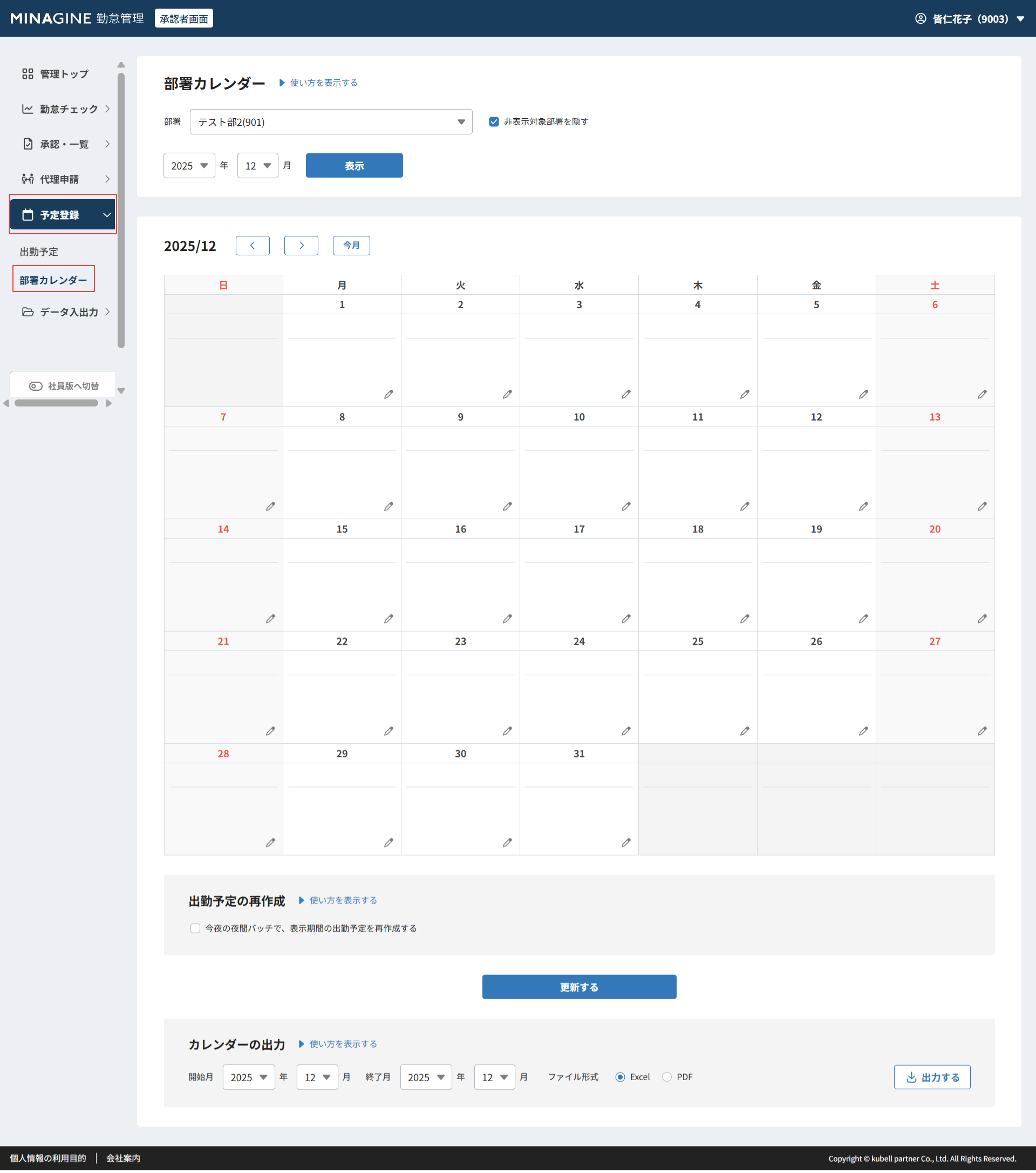部署カレンダーは 、上位部署または自分の所属している部署の業務カレンダーを確認できます。