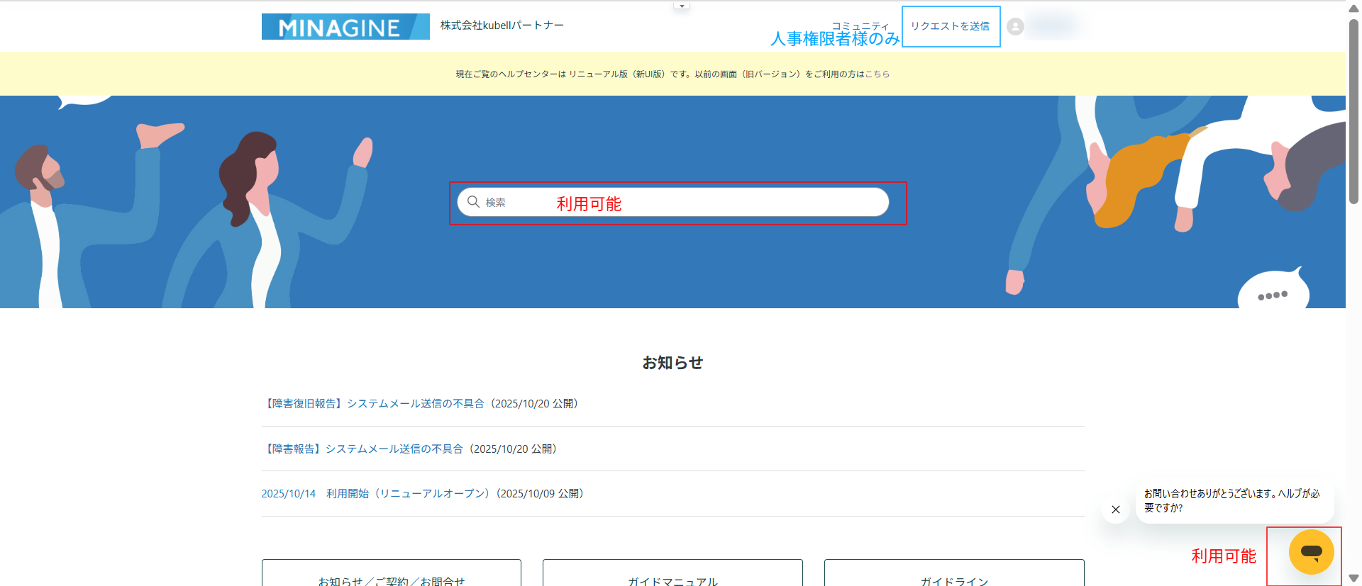 ①MINAGINE勤怠管理ヘルプサイトの右下のポップアップをクリックします。