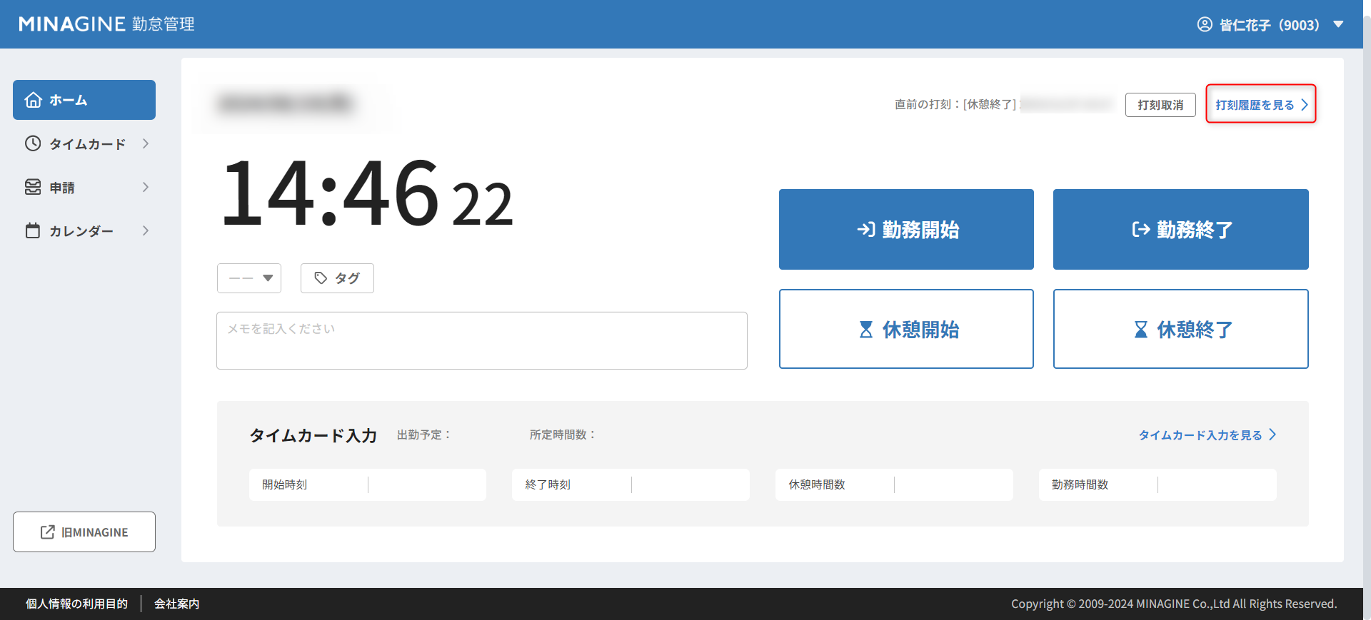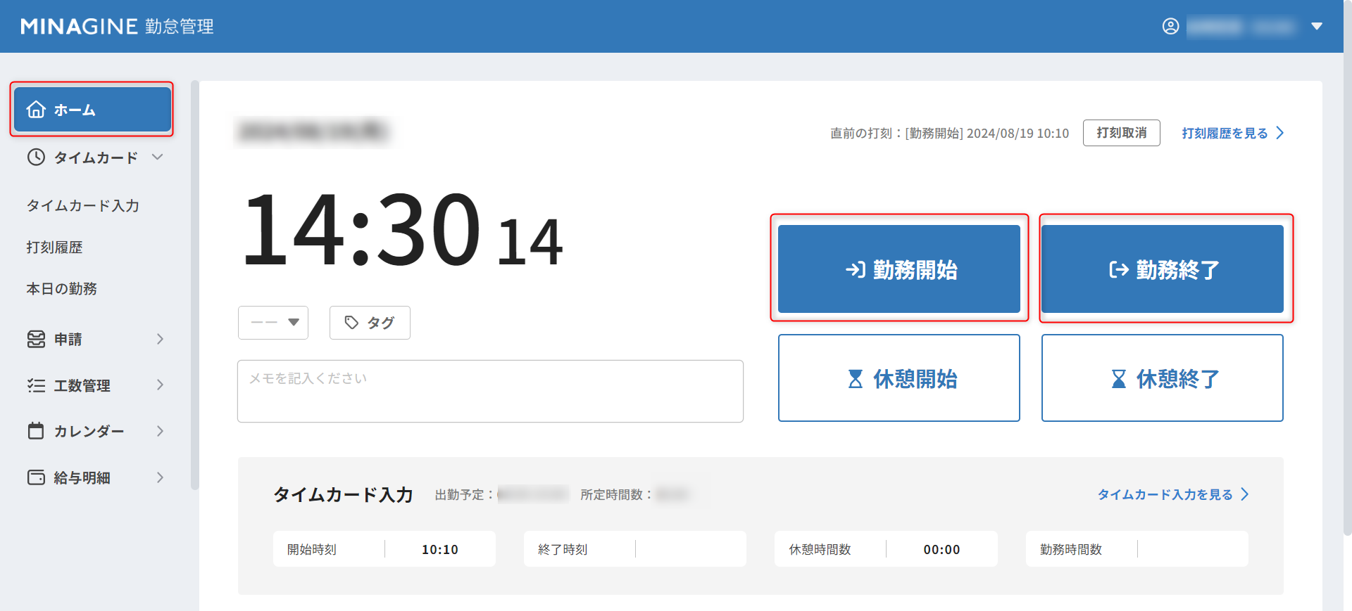 ※休憩ボタンは会社の設定によって非表示の場合もございます。