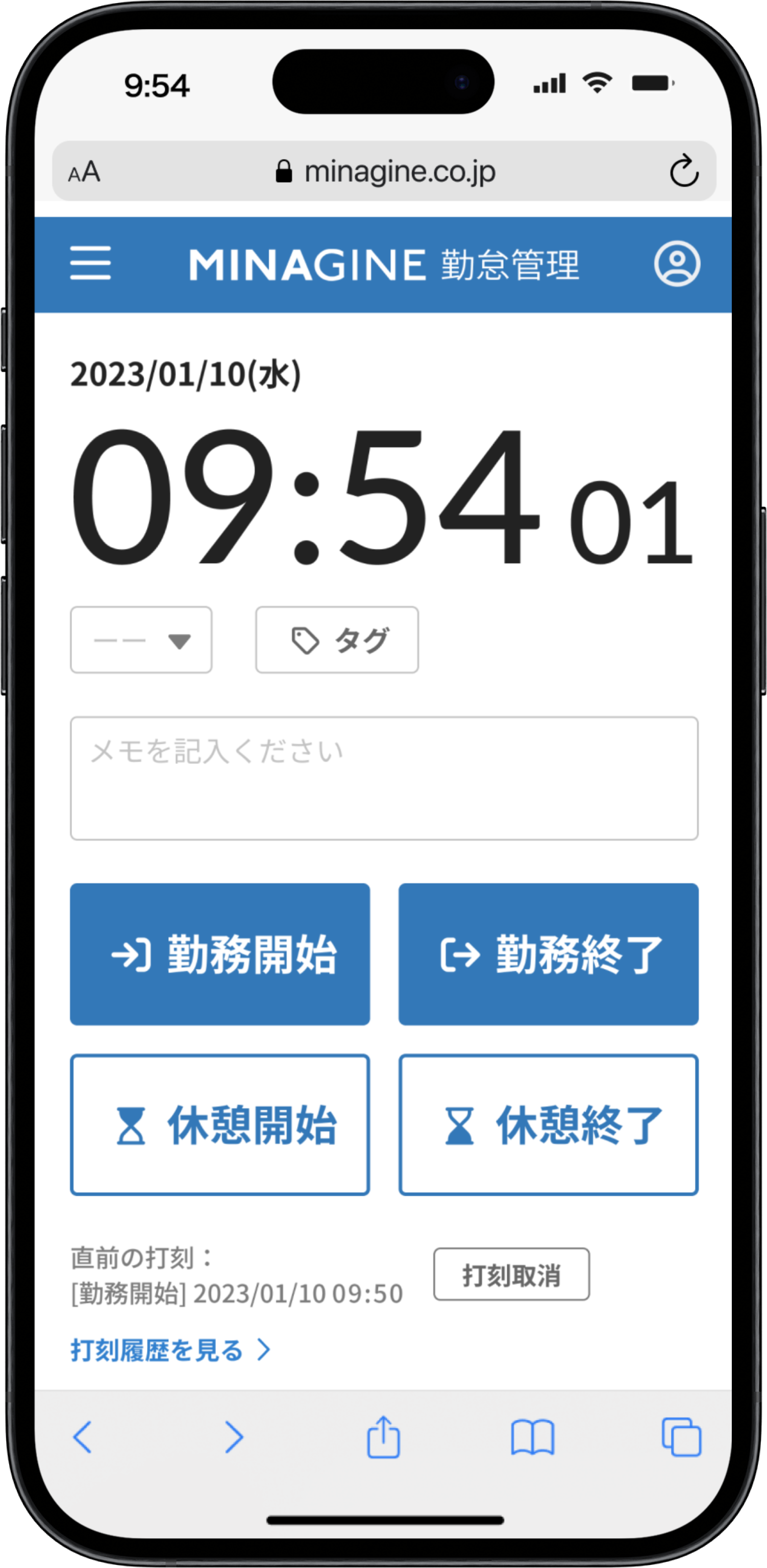 「勤務開始」または「勤務終了」をクリックします。