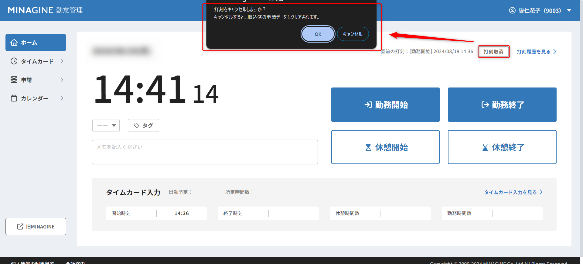 ②「打刻をキャンセルしますか?」のポップアップ画面が画面上部に表示されるため、[OK]をクリックします。
