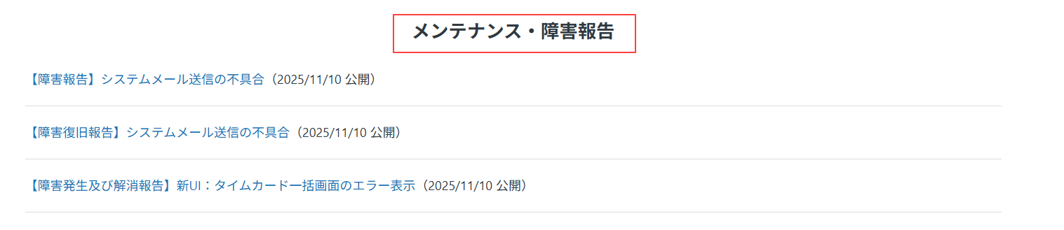 ヘルプサイト上部に表示されている、「メンテナンス・障害報告」にて随時掲載を行っております。