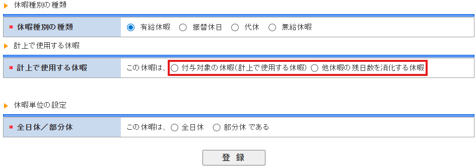 例えば年次有給休暇がすでにあり、半休や時間単位休暇を作成するような場合になります。