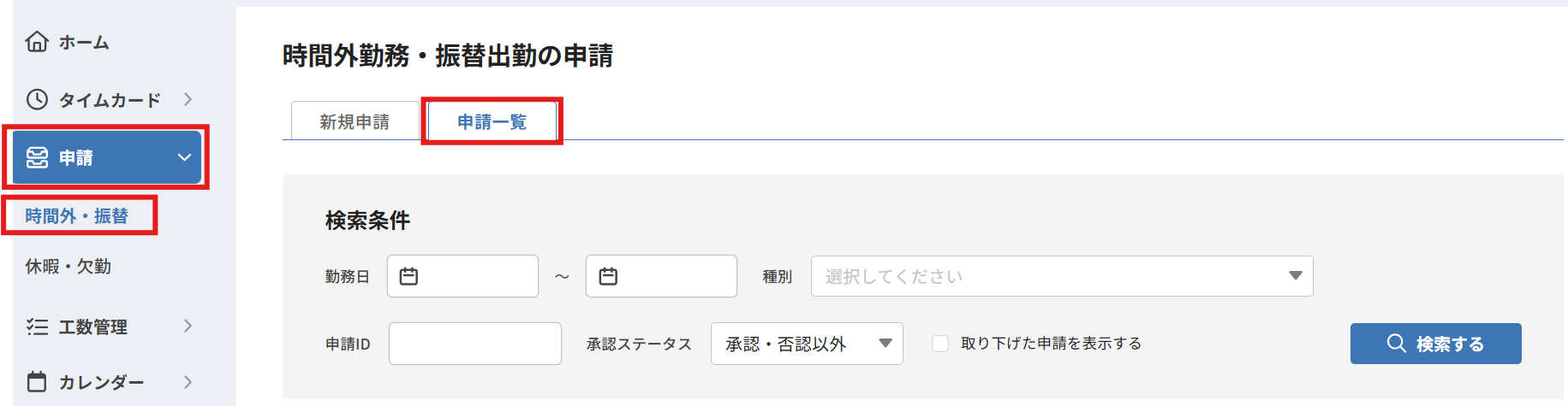 ①申請>時間外・振替>時間外勤務・振替出勤の申請 を開き、