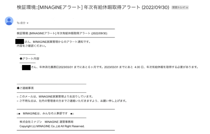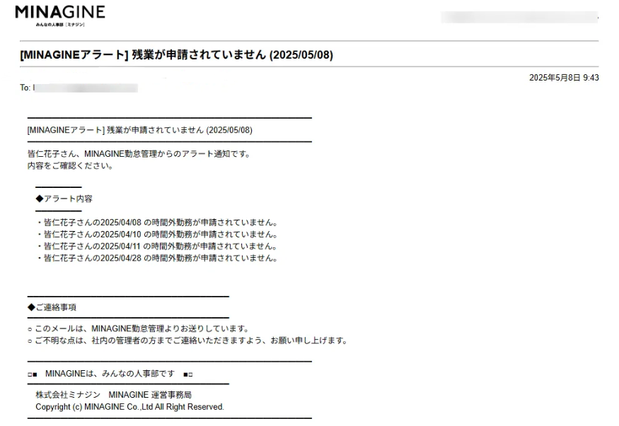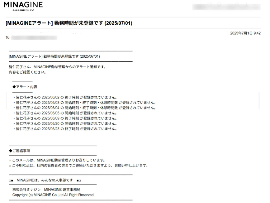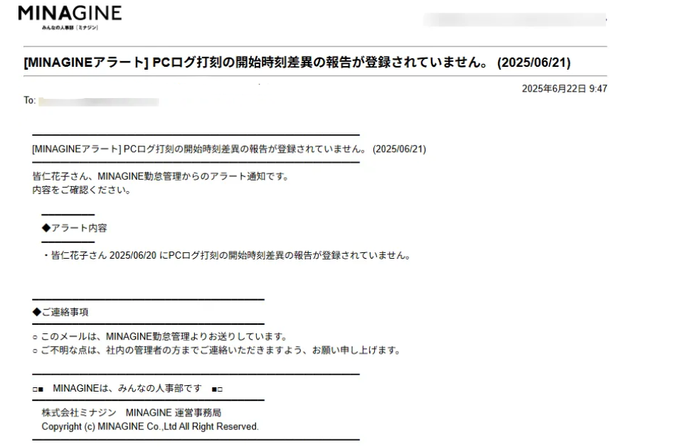 [社員名]さん、MINAGINE就業管理からのアラート通知です。