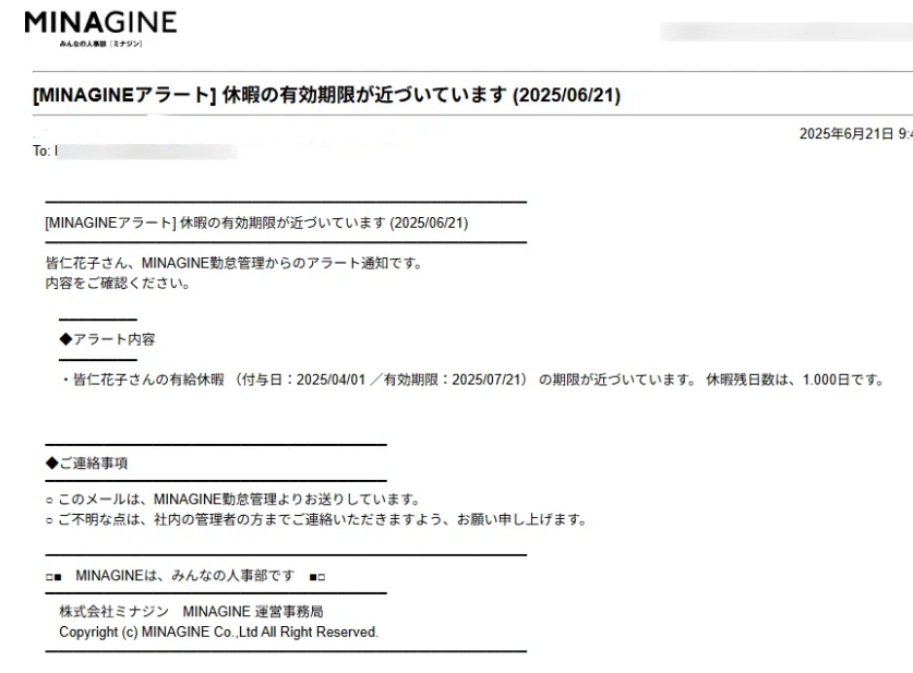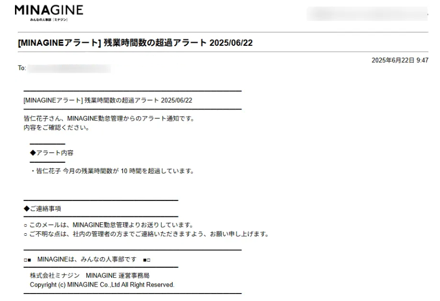 {承認者様のお名前}さん、MINAGINE就業管理からのアラート通知です。